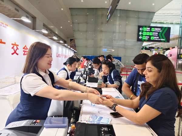 Two service counters have been set up inside the Canton Fair complex — at Exhibition Hall B-2 and Exhibition Hall A 5-1. Staff from 11 airlines, including China Southern, Air China, China Eastern, Shenzhen Airlines, and Ethiopian Airlines, are offering on-site check-in, baggage through-services, ticket inquiries, and VIP assistance. Airlines are also promoting special offers such as extra baggage allowances and cultural gifts.