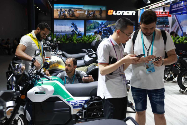 Visitors check out motorcycles displayed during the 135th China Import and Export Fair, also known as the Canton Fair, in Guangzhou, Guangdong province, in April.