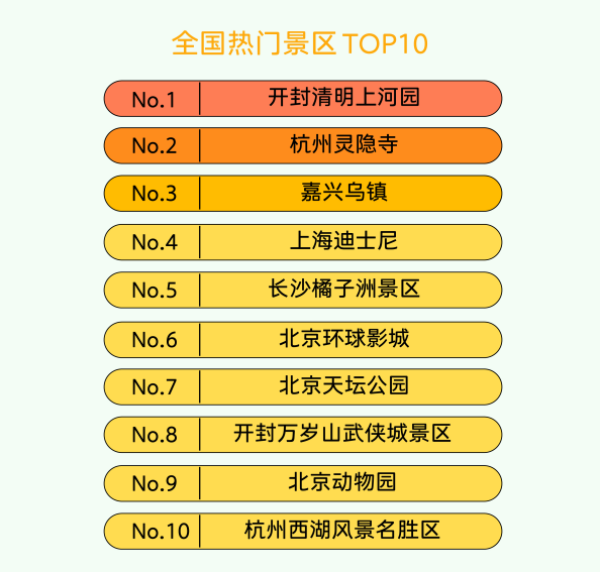 In the top 10 list of popular tourist attractions nationwide, Qingming Shanghe Garden in Kaifeng ranked first, followed by Lingyin Temple in Hangzhou, Wuzhen Ancient Town in Jiaxing, Shanghai Disneyland Resort, and Orange Isle Scenic Area in Changsha.