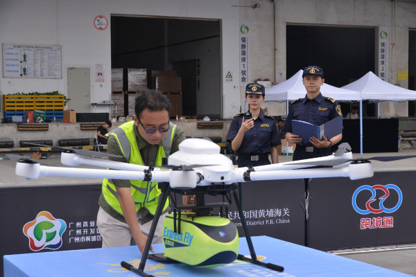 Huangpu Customs officers supervise the delivery of cross-border e-commerce imported goods by drones in the Huangpu Comprehensive Bonded Zone.
