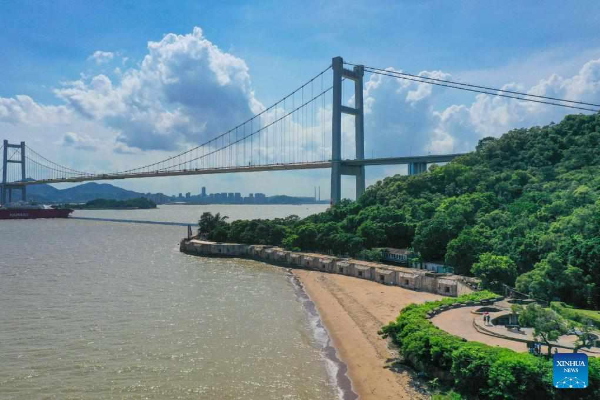 An aerial drone photo taken on June 23, 2020 shows a view of the Humen Bridge, which links Guangzhou city and Dongguan city, in South China's Guangdong province.