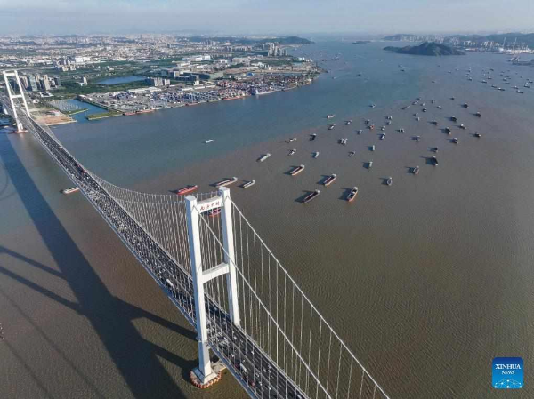 An aerial drone photo taken on October 2, 2024 shows a view of the Nansha Bridge, which links Guangzhou city and Dongguan city, and ships along the Shiziyang channel in the Pearl River Estuary area, in South China's Guangdong province.
