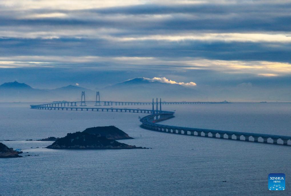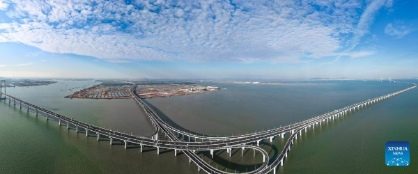 This photo taken on December 7, 2024 shows a view of Gaolan Port Bridge (with twin main towers on the left) and Huangmao Sea Channel Bridge (with three main towers on the right) in South China's Guangdong province.