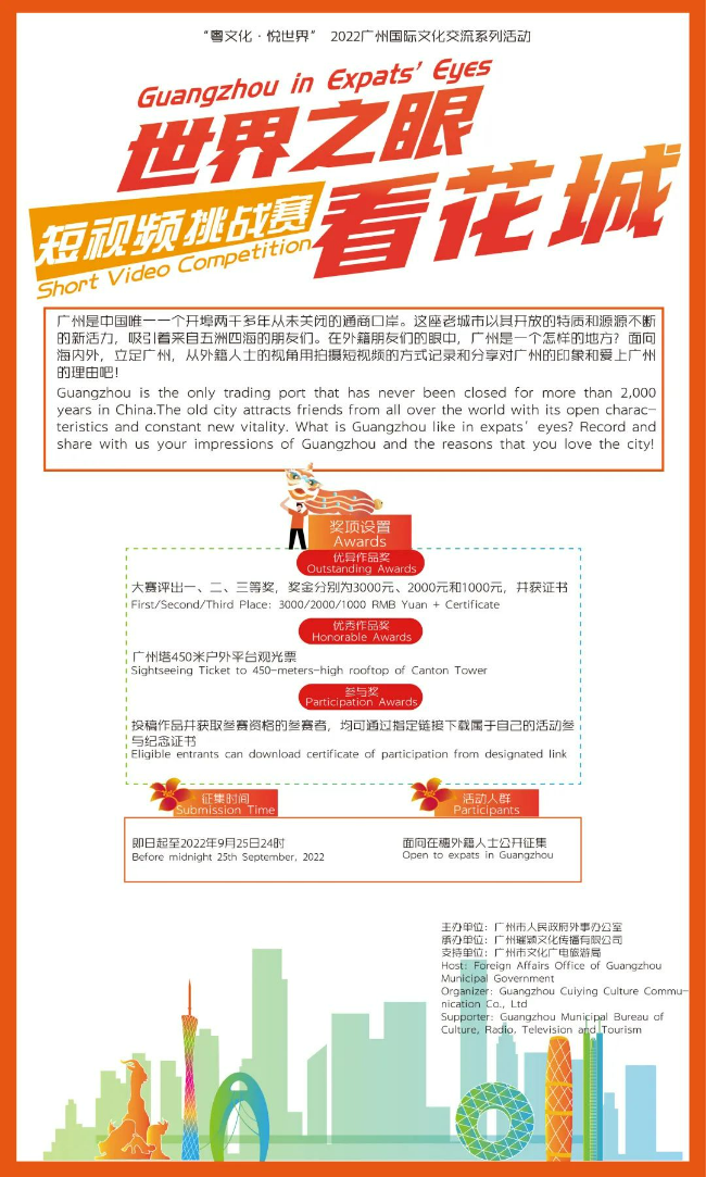 Guangzhou is the only trading port that has never been closed for more than 2,000 years in China.The old city attracts friends from all over the world with its open characteristics and constant new vitality. What is Guangzhou like in expats' eyes? Record and share with us your impressions of Guangzhou and the reasons that you love the city! Submission Time Entry requirements (2) Entries submitted should be narrated in expats’ perspectives and should feature Guangzhou, such as scenery, food, culture, arts and life, etc. (3) Entries submitted should be 30 to 180 seconds in length, clear and stable in quality, and without obvious noise. (4) Entries submitted can be in Mandarin, Cantonese or English. (5) Entrants should ensure that they are the author of the works they send, and have independent, complete, clear, and indisputable copyrights over the overall and part in their works; they should also ensure that the works they submit do not infringe on the legitimate rights and interests, including copyright, portrait rights, rights to reputation and privacy, of third party. (6) The Host has the right to disqualify any entrant who submits entries that may harm public order and social customs. “Entries that may harm public order and social customs” include but not limited to those involve conducts and behaviors that mislead the public or deemed deceptive and any other situation that violates laws, morality, public order or good social customs. (7) Entrants should provide name, nationality, contact information and title of submitted entries. (8) NO entry fee is required. (9)The Host respects and reserves the right of authorship and has the right to reproduce, distribute, exhibit, project and disseminate to the public through information networks of the submitted works for non-profit purpose without any further remuneration. (10) The Host reserves the right to final interpretation of the rules of the competition. By entering the competition, each entrant agrees with the rules mentioned above. How to enter To enter the competition, please send video with your name, nationality, contact information and title of the video to [email protected]. Entries will be screened by organizers for eligibility before being released on WeChat account of GuangzhouForeignAffairs("广州外事”, account: GZWS411665430) and Douyin account of VisitGuangzhou. Authors of eligible works will be notified by email. Winning Awards (1) Outstanding Awards (6 entries): First place (1 entry) :3000 RMByuan & Certificate; Second place(2 entries) : 2000 RMB yuan & Certificate; Third place (3 entries) : 1000 RMByuan & Certificate; Please note that tax incurred on prize money mentioned above should be taken care of by winners. (2) Honorable awards (20 entries): Sightseeing Ticket to 450-meters-high rooftop of Canton Tower & Certificate; (3) Participation awards: Eligible entrants can download certificate of participation from designated link. Selection Process To ensure transparency, objectivity, fairness and equitableness, the selection process includes public voting and expert review. The public will play a part by voting upon each individual video while the selection committee comprised of host, organizer, supporter and experts on media and international relations will review the entries. The final results will be announced on WeChat account of GuangzhouForeignAffairs and Douyin account of VisitGuangzhou before October 30th.