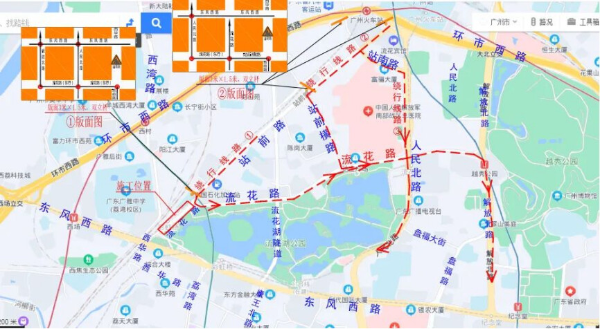 In addition, the routes of bus 181, 275 and the other buses that previously traveled in the direction of Xihua Road will be temporarily adjusted to travel via Renmin North Road, Dongfeng West Road, and Xihua Road, instead of traveling via Liuhua Road, and then connect back to the original routes. The above-mentioned routes will temporarily cancel the Zhanqian Crossroad (westbound) stop and Liuhua Road (westbound) stop.