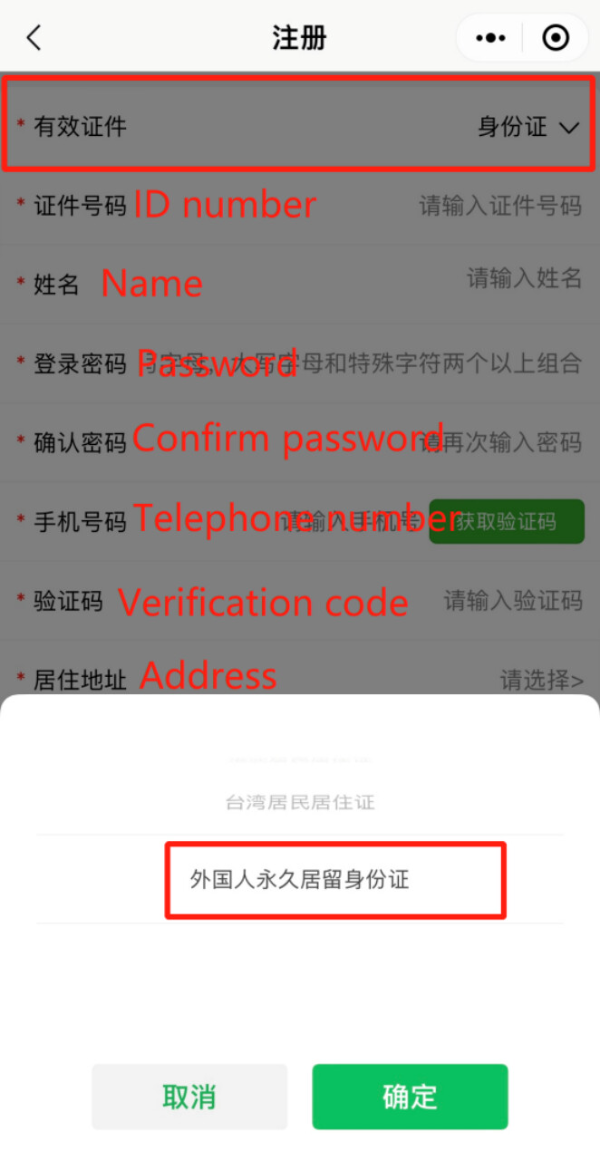 3. Choose "外国人永久居留身份证" (Foreign Permanent Resident ID Card) from the list of valid documents and then fill in the required information to complete the account registration.