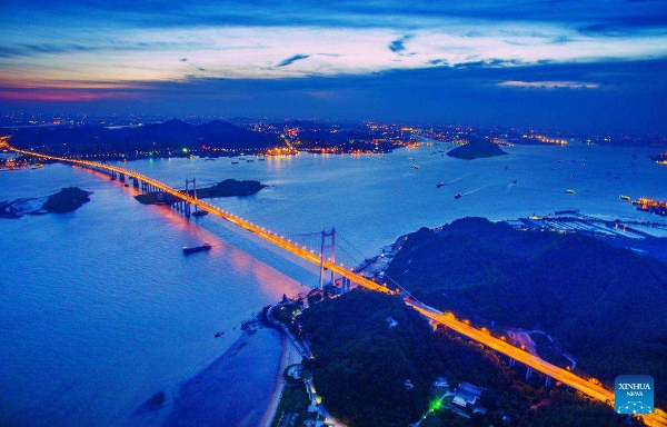 An aerial drone photo taken on June 29, 2022 shows a view of the Nansha Bridge, which links Guangzhou city and Dongguan city in South China's Guangdong province.