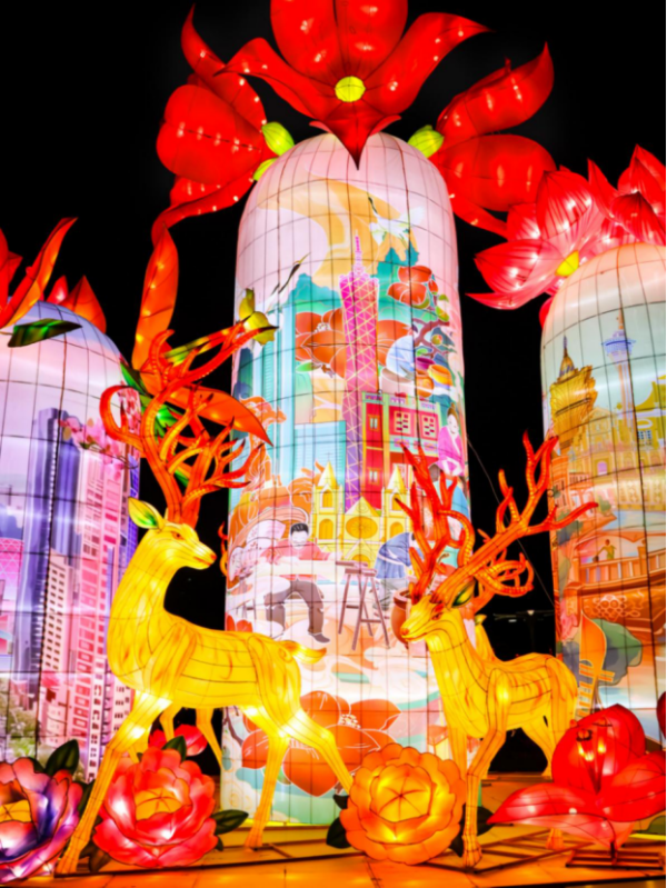 In the Southwest Plaza, the lantern installation "Radiant Greater Bay Area, A Tapestry of Blossoming Flowers" draws inspiration from the architectural and scenic landmarks of cities in the Guangdong-Hong Kong-Macao Greater Bay Area. It beautifully presents the integration and development of the Greater Bay Area in culture, technology, and more. Composed of five vase-shaped columns, the lanterns are adorned with painted landmarks of cities such as Guangzhou, Hong Kong, and Macao, topped with lanterns in the shape of each city's floral emblem, such as the red cotton tree, bauhinia, and lotus, signifying the Greater Bay Area's flourishing future.