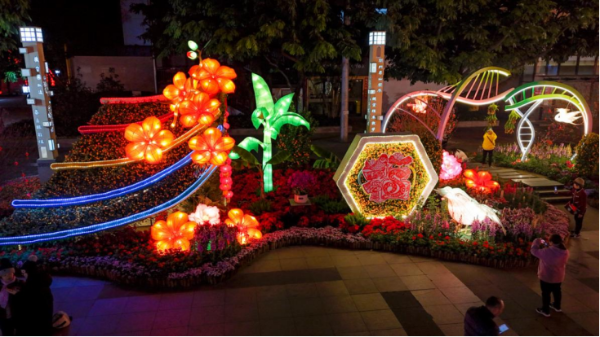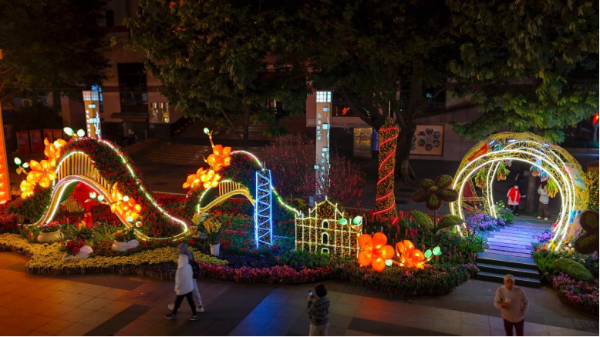 A notable feature of the lantern festival is the integration of floral arrangements and lanterns, allowing visitors to enjoy flowers by day and lanterns by night. Along the eastern axis of the main entrance, the installations utilize unique techniques to create landmarks like the Canton Tower, the Bank of China Tower in Hong Kong, and the Ruins of St. Paul's in Macao out of tangerines and floral arrangements.