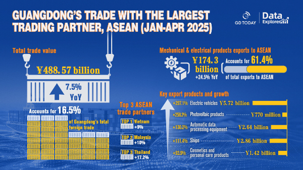 According to customs data, Guangdong's trade with ASEAN remained robust in the first four months of 2025. From January to April, total imports and exports between Guangdong and ASEAN reached 488.57 billion yuan, marking a 7.5% year-on-year increase and accounting for 16.5% of the province's total foreign trade.