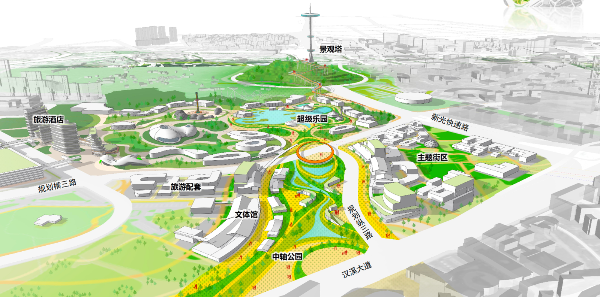 The 43-hectare theme park will offer upgraded attractions and a deeper immersive experience. Additionally, there will be a central park covering 9 hectares, themed around cultural and recreational activities for residents. A 13-hectare tourist transportation plaza will integrate tourist distribution plaza, parking structures and bus terminals. A 15-hectare themed district is planned as an open recreational street featuring cultural tourism, shopping, dining, studios, and accommodations.