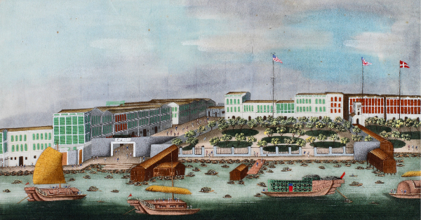 Pith Painting of watercolor harbor scenery (Thirteen Hongs Business District) in the 19th century, Guangzhou thirteen Hongs Museum’s collection