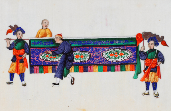 Pith painting of watercolor carrying a flag in 19th century, Guangzhou thirteen Hongs Museum’s collection