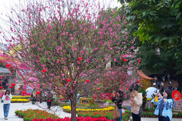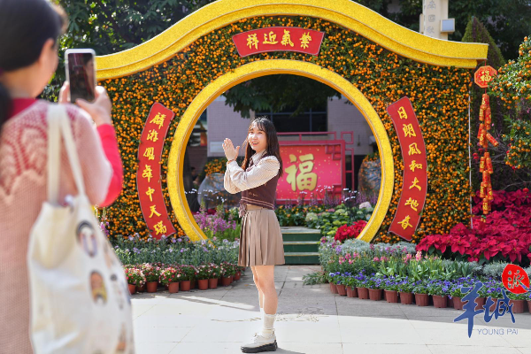 What is the most beloved spot to take photos? It would be the large peach tree directly facing the main entrance of the park, which is 5.5 meters high and 5 meters wide, making it the largest one of its type ever showcased at the Market.On two sides of the entrance, the displays named "Auspicious Gates" constructed from kumquats are novel addition this year, as it is the first time to use kumquats here, which symbolize great luck and prosperity. A large kumquat tree is also included, approximately 3 meters tall, making it the largest one of its kind ever exhibited at the Market.
