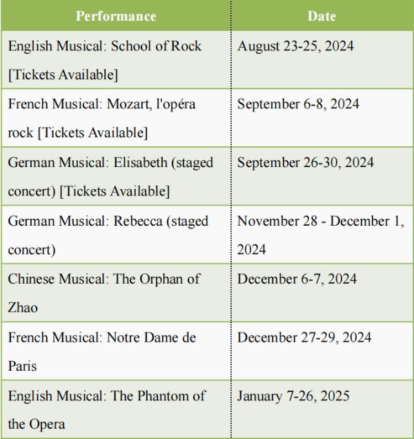 Another German musical, "Rebecca", adapted from Daphne du Maurier's novel of the same name, will be staged from November 28 to December 1. This production will be presented in a newly produced semi-staged concert version, accompanied by a full orchestral ensemble and original costumes. Over 20 actors will bring the entire original score to life in its first show on the Chinese mainland.