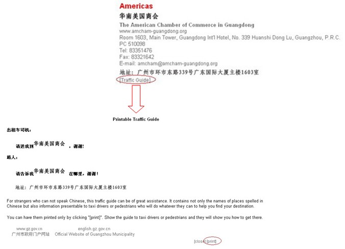 Traffic guides to major organizations (Business Associations, Consulates and Banks) are available. You can have them printed only by clicking "[Traffic Guide]" and "[print]" on the window open. Show the guide to taxi drivers or pedestrians and they will show you how to get there.
