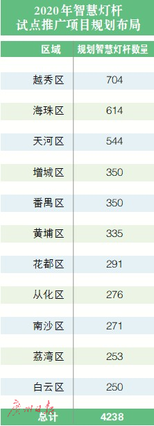根据规划,2020年广州智慧灯杆规划建设总量为4238根,覆盖道路842条,辐射面积3242.89平方公里。建设区域选取各区人流旺地,核心商圈进行规划,范围涵盖运营商微基站挂载需求的路段点位,广州11个区的智慧灯杆示范试点推广项目。其中,越秀区规划智慧灯杆数量为704根,为各区最多,海珠区紧随其后建设614根智慧灯杆。
