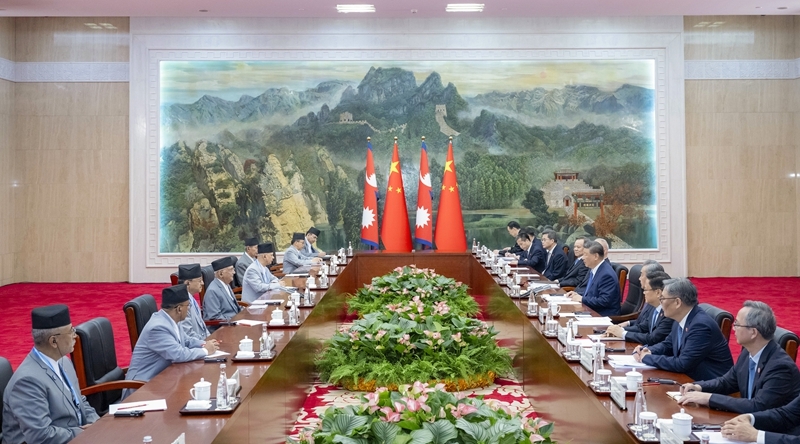 习近平指出,中国和尼泊尔是山水相连、世代友好的邻邦,也都是热爱和平、自立自强的国家。建交70年来,两国人民风雨同舟、休戚与共,共同书写了中尼睦邻友好的历史篇章。当前,中尼高质量共建“一带一路”合作稳步推进,两国人民更加相知相亲。中方愿同尼方一道努力,赓续传统友谊,推动中尼面向发展与繁荣的世代友好的战略合作伙伴关系得到新的更大发展。
