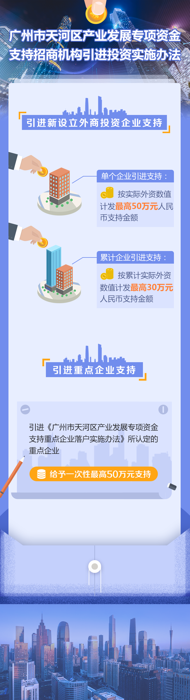 围绕总部、金融、科技等高端集聚要素,对标国际先进城区,我区进一步加大了对重点企业的引进力度,扩大了认定范围,提高了支持金额。按重点企业的能级分档次予以支持,世界500强、中国500强企业本部落户,给予2000万元支持;法人金融机构、全国性金融市场交易平台等企业本部落户,给予最高1500万元的支持;福布斯全球2000强、中国民营企业500强、中国服务业100强、中国连锁企业100强、省级骨干企业本部落户,给予1000万元支持;管理规模达到100亿元以上的国家、省、市重大股权投资基金,给予股权投资管理企业一次性1000万元支持;广东省、广州市认定的总部企业或商务部认定的跨国公司本部等给予最高500万元支持;创新型重点企业成长性好的,给予最高180万元支持;对天河区有特别重大经济社会发展贡献的企业集团落户,给予最高1亿元的支持;对产业集聚引导作用突出的企业,经区政府批准同意,另行予以重点支持。