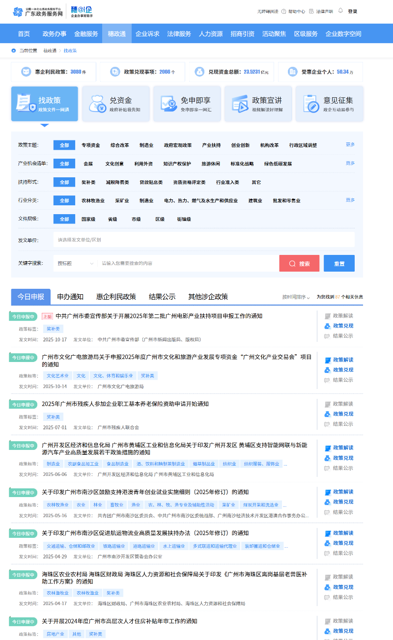 作为广州市统一的企业服务总门户,“穗@i企”平台政策“源头”为广州市政策文件库,通过统一标准接口获取最权威的政策版本后,平台用大数据算法给企业“画像”,再和政策标签智能匹配。据统计,平台整合了3000多件惠企政策、3500多份解读文件、2000多项兑现事项。截至目前,已为225万家企业精准推送了4721多万次政策提醒,30多万家经营主体通过它拿到了10多亿元补贴,真正实现“政策找企业”“补贴一键达”。