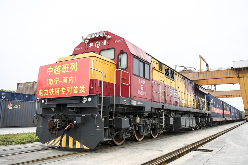 2024年3月8日,在广西南宁国际铁路港,电力铁塔专列准备发车。当日,一列满载340吨电力铁塔的中越班列从南宁国际铁路港开出,发往越南河内。