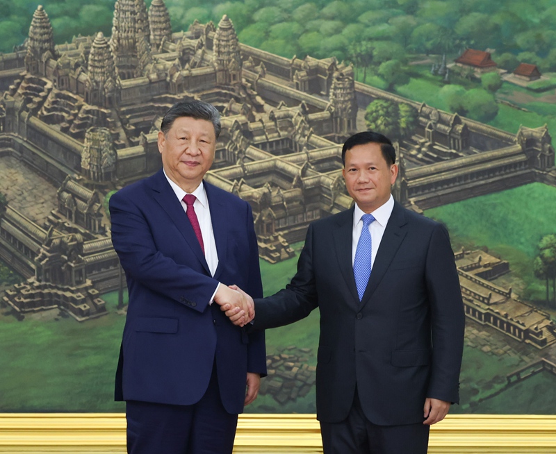 新华社金边4月17日电 4月17日晚,国家主席习近平同柬埔寨首相洪玛奈在金边和平大厦举行会谈。两国领导人一致同意携手构建新时代全天候中柬命运共同体,宣布2025年为“中柬旅游年”。