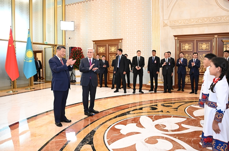习近平抵达阿斯塔纳纳扎尔巴耶夫国际机场时,托卡耶夫总统率总统办公厅主任达杰拜、副总理兼外长努尔特列乌、总统外事顾问卡济汉、阿斯塔纳市长卡瑟姆别克等高级官员热情迎接。身着盛装的哈萨克斯坦女青年向习近平献花。礼兵分列蓝地毯两侧致敬,哈萨克斯坦少年儿童手持中哈两国国旗热烈欢迎习近平到访。习近平在托卡耶夫陪同下观看仪仗队分列式,直升机悬挂中哈国旗从机场上空飞过。在机场贵宾楼内,两国元首还共同欣赏哈萨克斯坦少年儿童的文艺表演。
