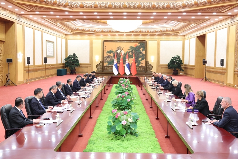 9月4日下午,国家主席习近平在北京人民大会堂会见来华出席纪念中国人民抗日战争暨世界反法西斯战争胜利80周年活动的塞尔维亚总统武契奇。