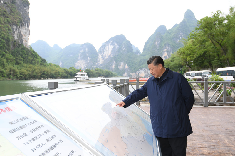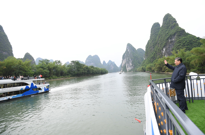 近年来,桂林市大力推进漓江“治乱、治水、治山、治本”,改善了漓江生态环境。25日下午,习近平来到桂林市阳朔县漓江杨堤码头,听取漓江流域综合治理、生态保护等情况汇报,并乘船考察漓江阳朔段。他强调,要坚持山水林田湖草沙系统治理,坚持正确的生态观、发展观,敬畏自然、顺应自然、保护自然,上下同心、齐抓共管,把保持山水生态的原真性和完整性作为一项重要工作,深入推进生态修复和环境污染治理,杜绝滥采乱挖,推动流域生态环境持续改善、生态系统持续优化、整体功能持续提升。