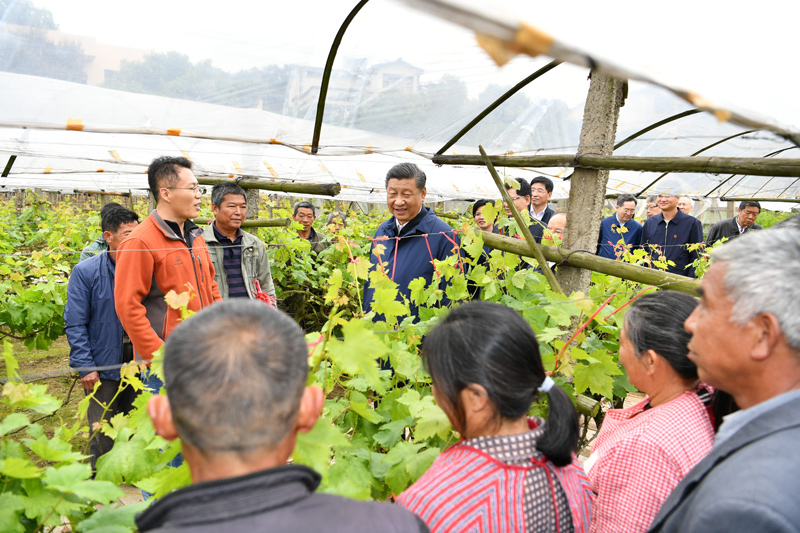 4月25日至27日,中共中央总书记、国家主席、中央军委主席习近平在广西考察。这是25日上午,习近平在桂林市全州县才湾镇毛竹山村,走进葡萄种植园,同农技人员和村民亲切交流。