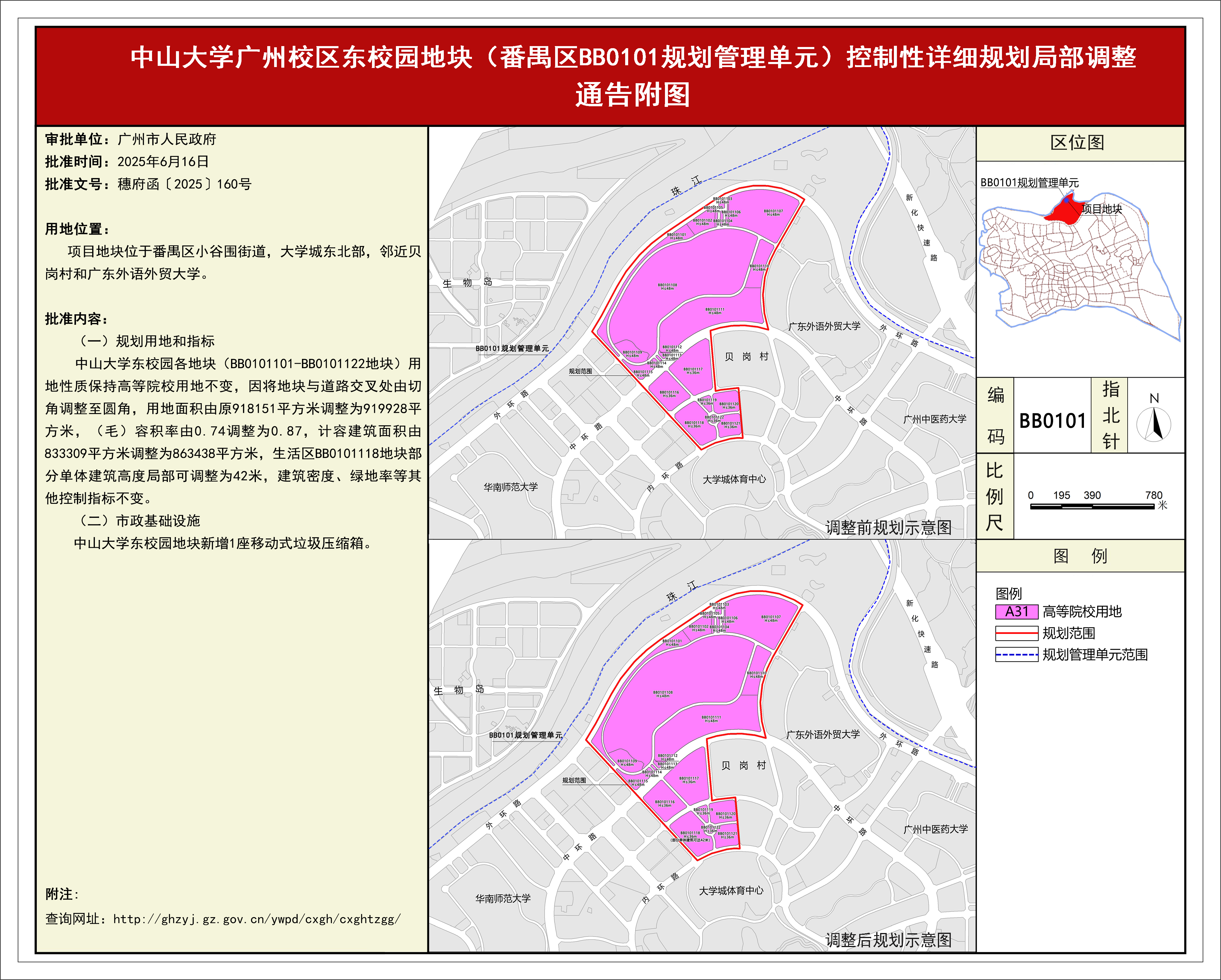 根据《广东省城市控制性详细规划管理条例》,《番禺区六涌河以北地块(BD0501规划管理单元)控制性详细规划局部调整》《中山大学广州校区东校园地块(番禺区BB0101规划管理单元)控制性详细规划局部调整》2项规划成果已完成编制、审查、公示等程序,由广州市规划委员会审议通过后经大阳城集团娱乐视频批准(穗府函〔2025〕160号),自批准之日(2025年6月16日)起生效。