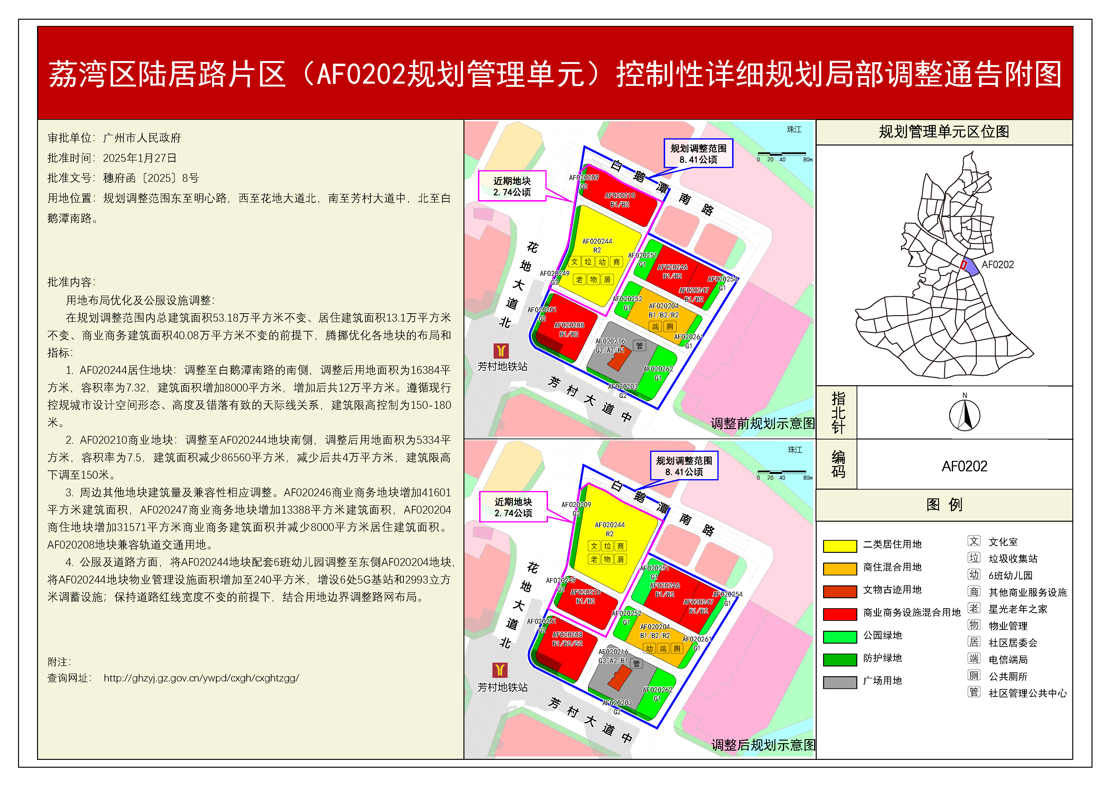根据《广东省城市控制性详细规划管理条例》,《荔湾区陆居路片区(AF0202规划管理单元)控制性详细规划局部调整》规划成果已完成编制、审查、公示等程序,由广州市规划委员会审议通过后经大阳城集团娱乐视频批准(穗府函〔2025〕8号),自批准之日(2025年1月27日)起生效。
