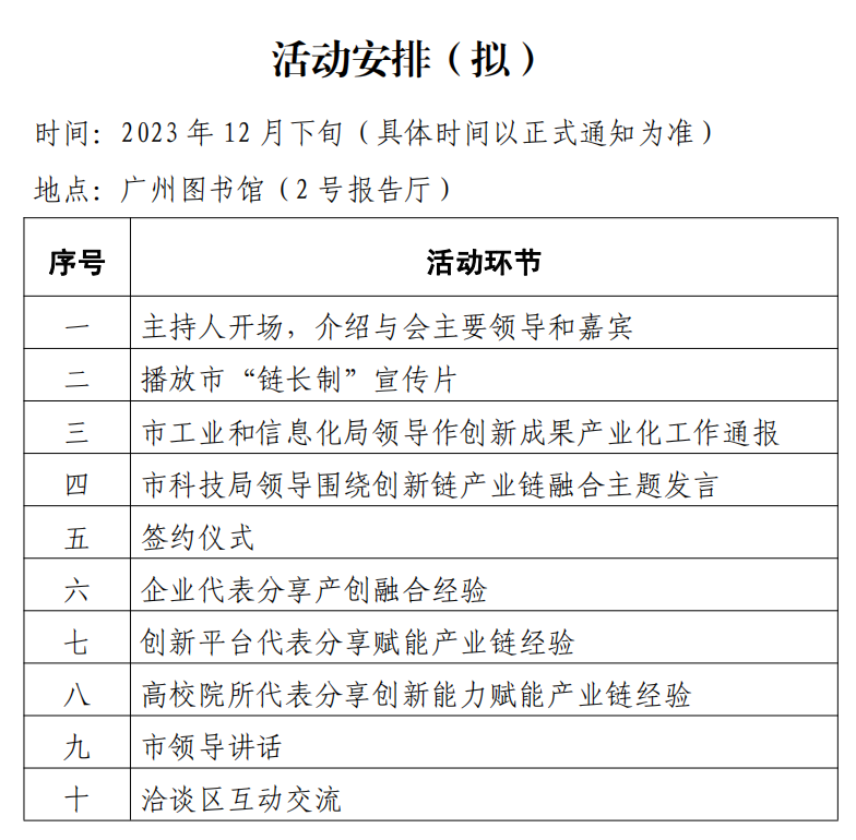 为贯彻习近平总书记关于推进新型工业化的重要指示,落实《广州市构建“链长制”推进产业高质量发展的意见》(穗厅字〔2021〕17号),坚持“产业链出题、创新链答题”,从需求侧推动创新成果有效“赋智”企业,解决一批共性和关键性技术攻关的路径和成本问题,推动产业链与创新链深度融合,加快推进新型工业化建设。市“链长制”办公室(市工业和信息化局)拟于12月下旬在“2023广州国际创新节”活动期间举办“产创融合·赋智链企”重点产业链创新成果产业化供需对接暨市“链长制”创新专题会议(具体活动安排以正式通知为准),现将有关事项通知如下: