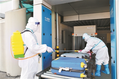 南航严格执行机下、分拣区行李消杀工作,航班到达后,在海关焖舱消杀后,在停机坪对行李容器及行李实行机下行李消杀,并在卸载线区域实行对入境行李逐一消杀,确保旅客行李安全。