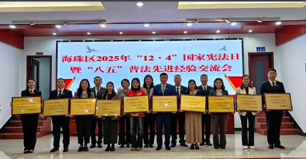 12月4日,海珠区举行2025年“12·4”国家宪法日暨“八五”普法先进经验交流会,会议通过表扬先进、分享经验,系统梳理该区普法工作的创新成果。会议表扬了类型多样、各具特色的“十佳普法阵地”——海珠区四叶草青少年法治教育基地、海珠区法治文化主题公园等,通过构建“专业基地引领、基层站点支撑、公共空间浸润、主题展馆深化”四位一体的普法阵地体系,推动法治宣传从单向灌输向多元互动转变,实现普法效能全面提升;表扬了“十佳普法讲师”和13名“优秀普法讲师”。他们所代表的普法讲师团队,汇聚了法治全链条的专业力量,实现了普法工作从“单兵作战”到“集团协同”的跨越;表扬了10名优秀法治副校长,展现了他们“安全教育、行为引导、危机干预、司法保护”四位一体的综合育人风采。随着普法阵地、普法讲师、法治副校长“三大支柱”的持续巩固与协同发力,海珠区覆盖全域、响应及时、供给精准的普法新格局正在加速形成,为推动法治社会建设、营造全民尊法学法守法用法的良好氛围注入了强劲而持久的动力。