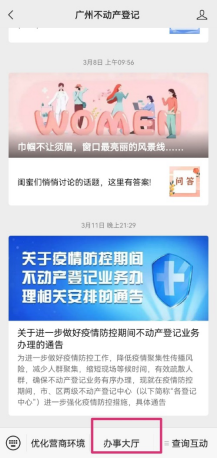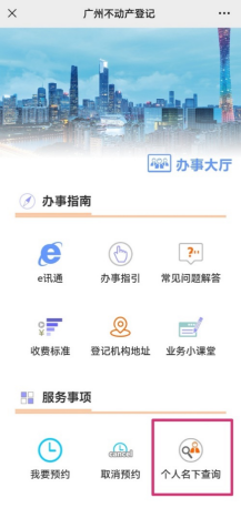 1.打开“广州不动产登记”微信供公众号,选择“办事大厅”,再选择“个人名下查询”。