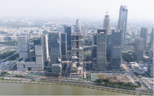 琶洲西区精心布局三重天际层次,与珠江岸线形成和谐对话:一线以海洲路西侧标志性建筑群为视觉焦点,中层天际线以广场与公园周边建筑群为制高点,而远处以中心高层建筑群为顶点,构建了一幅错落有致的三维天际画卷。随着360米高的广商中心大厦的圆满封顶及320米高的南方传媒大厦的火热建设,琶洲西区独具魅力的天际轮廓线已初步成形。