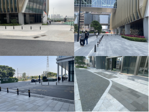 琶洲西区地块开发时,鼓励红线内外场地进行一体化设计与施工,景观绿化、广场与慢行道铺装、城市家具以及市政设施的风格、色调和材质应协调统一。并从人的出行体验出发,灵活布置场地的高程设计,退缩带、绿化带、骑行带、步行带、设施带应零高差联通,严格控制设置台阶,确保骑行、步行与设施带之间的平顺过渡,无高差联通,形成无障碍的、安全平顺的场地环境。