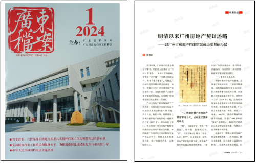 近日,2024年第1期《广东档案》刊发了广州市房地产档案馆的契证研究文章《明清以来广州房地产契证述略——以广州市房地产档案馆馆藏历史契证为据》,该文以详实的史料为基础,深入剖析了明清、民国时期广州市房地产契证的管理方式、机构变迁以及不同时期的契证特点,为后续契证研究提供了参考和启发。