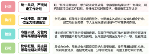 建立“统筹调度、领导带头、全局紧跟、大干快上”工作格局,强化“任务清单--部门执行--督导检查--问题处理”,实现“计划-实施-检查-行动”闭环管理。