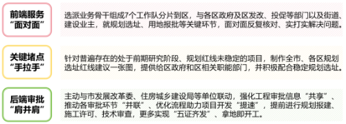 关键堵点“手拉手”,针对各区普遍存在的因尚处于前期研究阶段、或者已立项但规划红线未稳定的项目,主动提供规划选址(红线)建议,帮助选址确定。目前,市规划和自然资源局已制作全市、各区规划选址(红线)建议一张图,并全部提供给区政府和区相关职能部门。