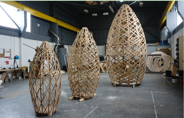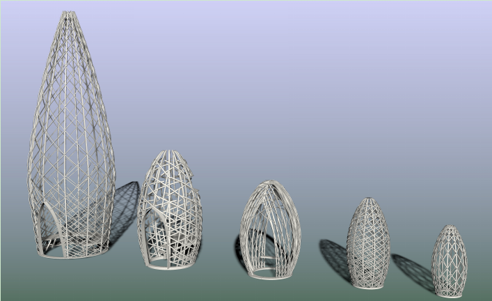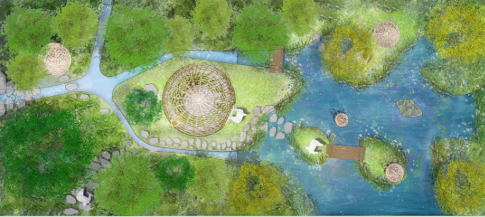 园内建筑为Moso毛竹编织结构,形似鸟巢,亦似细胞植物结构,灵感来自建筑和自然的融合,象征野外栖居地。主建筑分别为中心塔、游玩塔、自然野生塔、自然观赏庇护塔,兼具游客社交、教育、娱乐或休息功能和动物的抚育、栖息、玩耍功能。塔身结构应用3D打印技术,由压制、压层、蒸和弯曲的可降解材料制成,这种层压材料不仅非常坚固耐用、美丽自然还可循环回收利用。五个大小迥异的巢式塔高度从1.7米到8.5米不等,每个塔都利用双曲拱形受理原理搭建轻盈而坚硬的外壳。