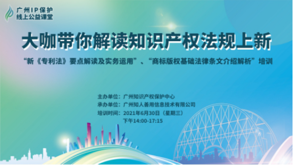 为进一步提升创新主体知识产权法律意识,广州知识产权保护中心于6月30日联合广州知人善用信息技术有限公司举办首场“广州IP保护”线上公益课堂——“大咖带你解读知识产权法规上新”。本次培训通过小鹅通直播平台对企业、高校、科研院所和服务机构知识产权相关从业人员,以及期望了解知识产权相关知识的公众等进行线上培训,参与人员约3000人次。