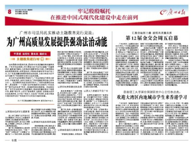 6月8日,《广州日报》以《广州市司法局扎实推动主题教育见行见效:为广州高质量发展提供强劲法治动能》为题,专题报道了广州市司法局扎实推动主题教育,以高水平法治护航高质量发展。