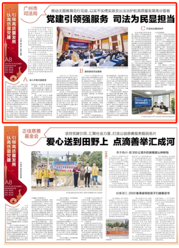 近日,《羊城晚报》在“以高质量党建引领高质量发展”“七一”建党纪念日特别报道专栏,以《广州市司法局:推动主题教育见行见效,以实干实绩实效交出法治护航高质量发展高分答卷 党建引领强服务 司法为民显担当》为题,专题报道广州市司法局工作情况。