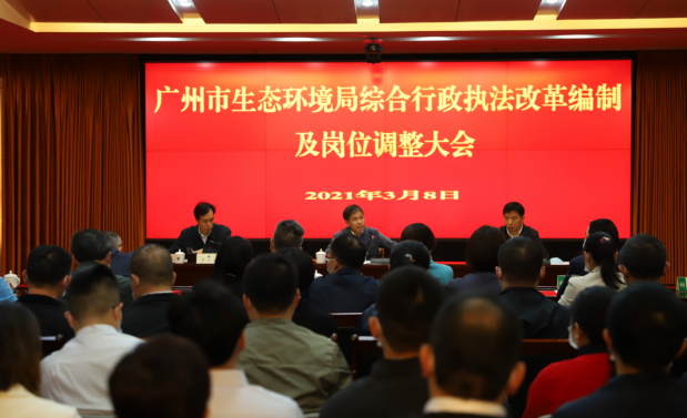 2021年3月8日下午,党组书记、局长杨柳在局机关1601会议室主持召开市生态环境局综合行政执法改革编制及岗位调整大会,深入贯彻落实国家、省、市关于深化生态环境保护综合行政执法改革精神。局领导,局机关各处室、各分局、监测站、各直属单位主要负责人,原执法支队全体在编干部参加了会议。
