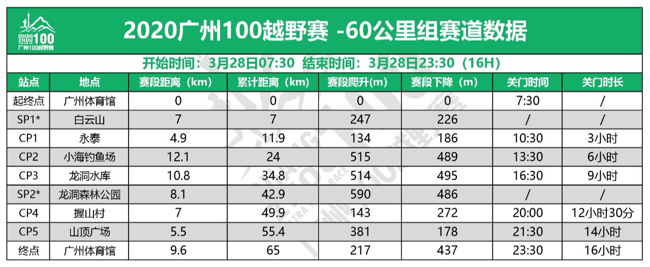 60公里组:实际距离65公里,关门时间16小时,累计爬升2788米,ITRA积分3分(已认证)。路线:广州体育馆东广场(起点)-云溪生态公园-白云山(SP1)-永泰(CP1)-六片山-小海钓鱼场(CP2)-龙洞水库(CP3)-龙洞森林公园(SP2)-握山村(CP4)-白云山-山顶广场(CP5)-广州体育馆东广场(终点)