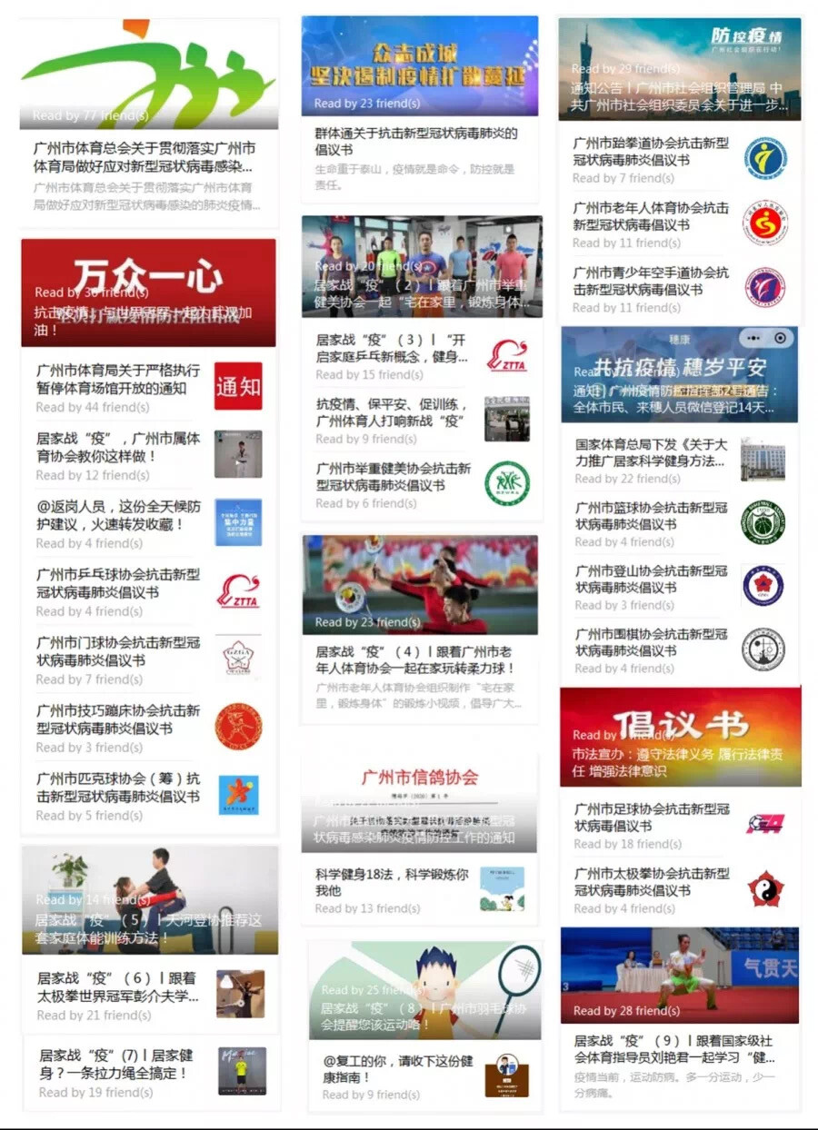 截至2月27日,居家战“疫”系列已在广州市体育总会微信公众号、官方微博、群体通和各市属体育协会等自媒体平台连载25期,超过50万人次阅读关注。同时,市体育总会也对市属体育协会参加社区一线防疫志愿服务、群体通社会场馆防疫行动等进行了系列报道,共发布推文120多条。