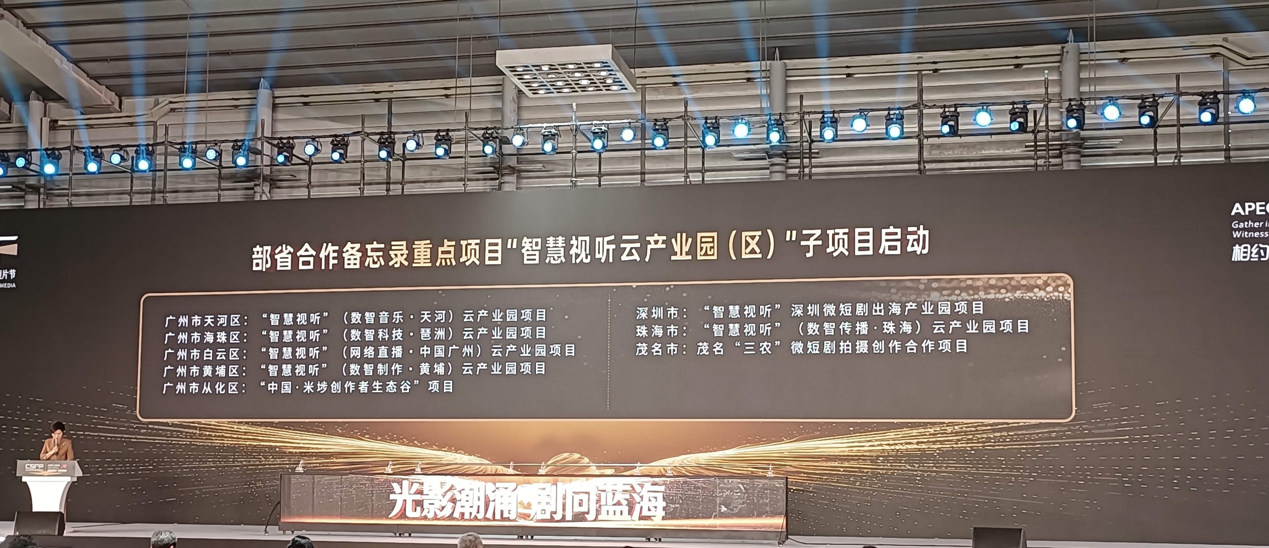 3月15日,在深圳第十五届中国国际新媒体短片节开幕式上,广东省部合作备忘录重点项目“智慧视听”云产业园(区)子项目启动仪式举行。广州、深圳、珠海、茂名4市共8个子项目集中启动,其中广州市5个项目同步亮相启动,标志着广州"智慧视听"云产业园(区)建设取得阶段性重要成果。