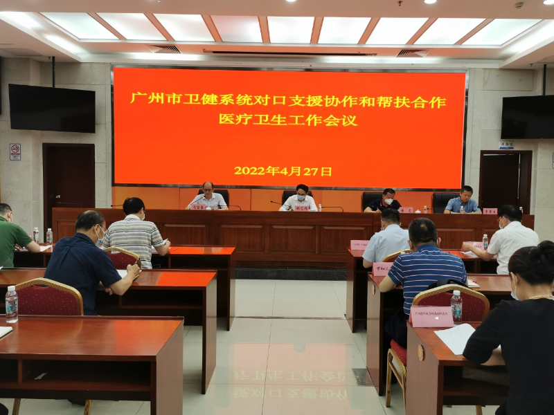 4月27日,广州市卫生健康委组织召开2022年度全市对口支援协作和帮扶合作医疗卫生工作会议,深入学习习近平总书记关于脱贫攻坚和乡村振兴重要讲话精神,贯彻落实国家和省市工作要求,扎实做好2022年对口支援协作和帮扶合作医疗卫生工作。广州市政府副秘书长、市卫生健康委主任赖志鸿,市协作办副主任陈震,广州医科大学医政医管处处长李章生出席会议并讲话,市卫生健康委一级调研员马坚奋主持会议。